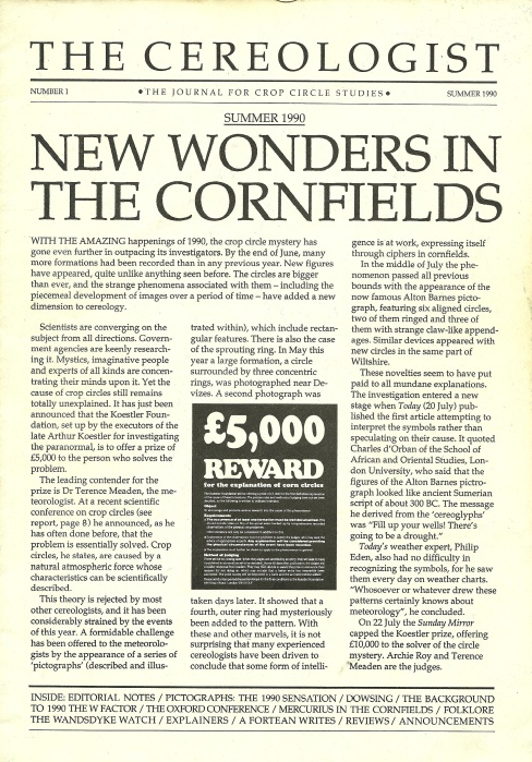A magazine called The Cereologist ("The Journal for Crop Circle Studies") was founded in 1990. The first issue, shown on the right, has a publication date of "Summer 1990."