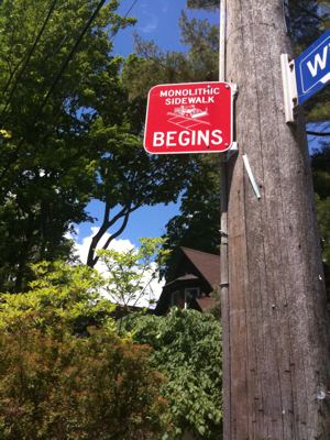 We've occasionally noticed small red signs on utility poles that say "monolithic sidewalk begins," which puzzled us because the sidewalk looked a lot like ones without such a serious-sounding designation. Adding to the puzzle is the white outline of a snow plow. … He explained that such sidewalks are too narrow to store snow pushed onto them by plows. The signs alert the plow driver "not to push the snow onto the sidewalk but leave it on the road, close to the curb.
